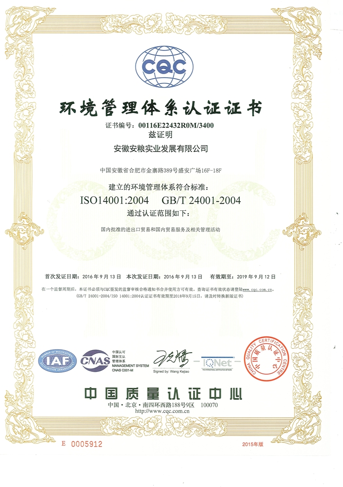 近期,安糧實業(yè)順利通過中國質(zhì)量認(rèn)證中心審核,在ISO9001認(rèn)證的基礎(chǔ)上又取得了ISO14001環(huán)境管理體系和OHSAS18001職業(yè)健康安全管理體系認(rèn)證證書。證書的獲得標(biāo)志著安糧實業(yè)建立了完整國際化管理體系,實現(xiàn)了ISO9001、ISO14001和OHSAS18001三個體系并行運轉(zhuǎn),必將促進(jìn)公司生產(chǎn)經(jīng)營活動更上一個臺階。