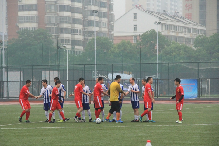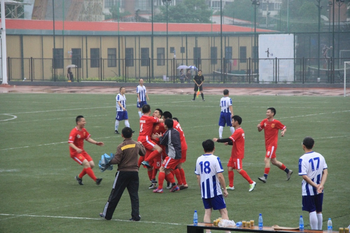 比賽開場不久,惡劣的天氣和球員的狀態(tài)不佳就讓我方遭到了懲罰,對方遠射,門將李釗不敢怠慢,奮力撲出第一點,無奈對方前鋒跟進補射得分。此后我方便開始奮力反撲,但始終不能攻破對手城池。第二節(jié),國貿(mào)聯(lián)隊的經(jīng)驗優(yōu)勢得以凸顯,他們站樁式的防守和不緊不慢的傳控,導(dǎo)致我方很長一段時間無法組織有效的進攻,加上我方隊員急躁的情緒,場面一度失控。休息時間全隊聚集討論,決定奮力一搏,隊長方波帶傷上陣,加強進攻。人員調(diào)整后,我方士氣明顯提升,經(jīng)過幾輪的組織,終于由徐學峰右路突破下底傳中,前點潘永博巧妙一漏,侯立峰左腳冷靜推射破門。一鼓作氣,方波角球精確助攻,對方中后衛(wèi)冒頂,侯立峰后點頭球再下一城。緊接著潘永博突破打門,對方門將脫手,方波跟進冒著左腿再次拉傷的危險,奮力將球打進,3:1鎖定勝局,全體隊員緊緊的擁抱在一起,場下啦啦隊也情緒高漲,擊鼓吶喊為安糧健兒加油。