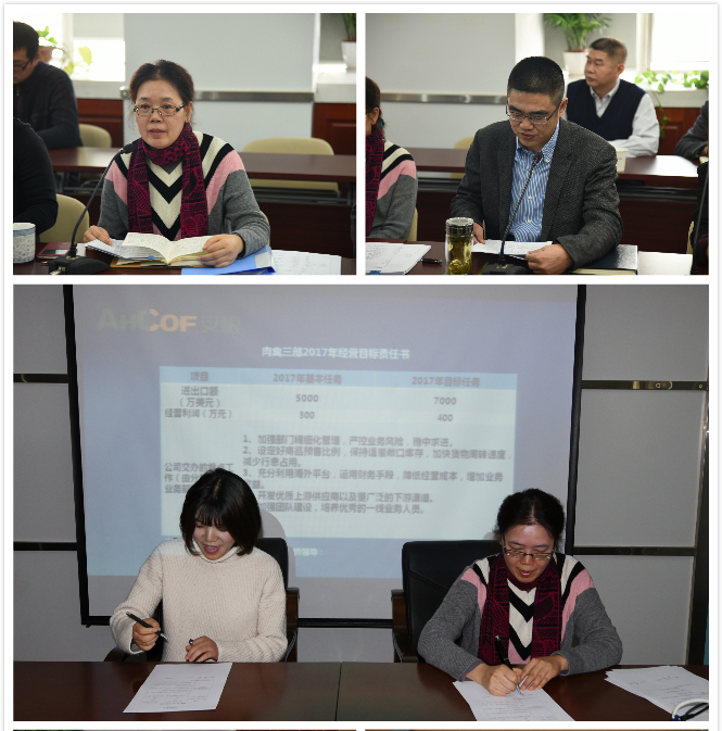 會上,相關業(yè)務部經(jīng)理及各子公司負責人做了匯報和交流發(fā)言。為了使各業(yè)務部和子公司更好的完成年度目標任務,清晰目標任務的各項要求,會議安排了簡約的簽約儀式,全體業(yè)務部經(jīng)理及子公司負責人與公司鄭重的簽訂了2017年經(jīng)營目標任務書。