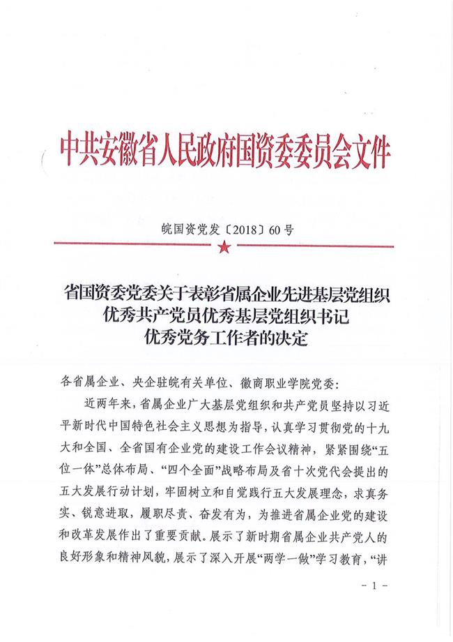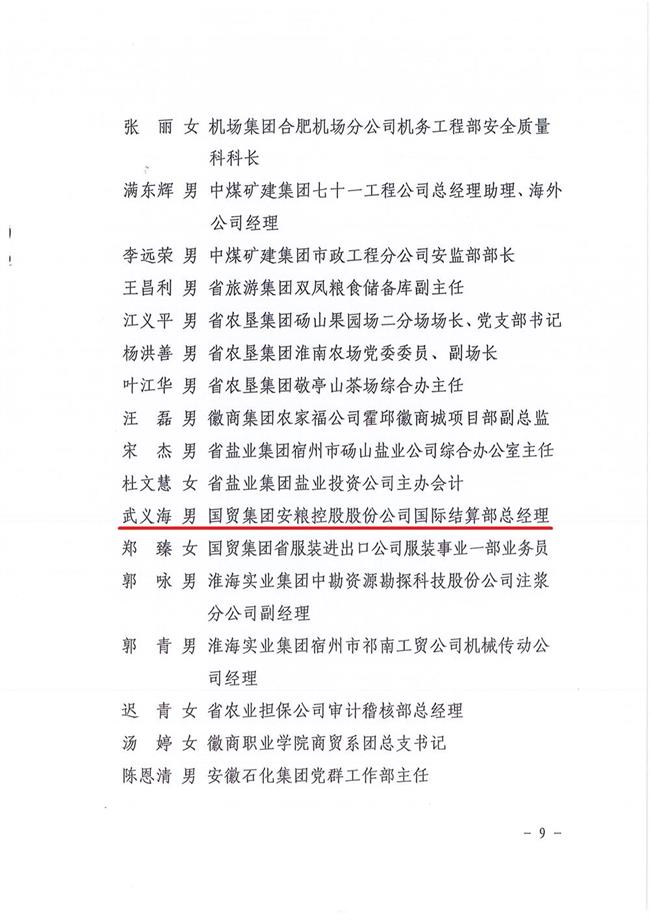 為大力弘揚黨的優(yōu)良傳統(tǒng)和作風,激勵省屬企業(yè)廣大基層黨組織和共產(chǎn)黨員在各自工作中充分發(fā)揮戰(zhàn)斗堡壘和先鋒模范作用,七一前夕,省國資委黨委下發(fā)《關于表彰省屬企業(yè)先進基層黨組織優(yōu)秀共產(chǎn)黨員優(yōu)秀基層黨組織書記優(yōu)秀黨務工作者的決定》,安糧控股國際結算部總經(jīng)理武義海同志榮獲安徽省國資系統(tǒng)“優(yōu)秀共產(chǎn)黨員”稱號。