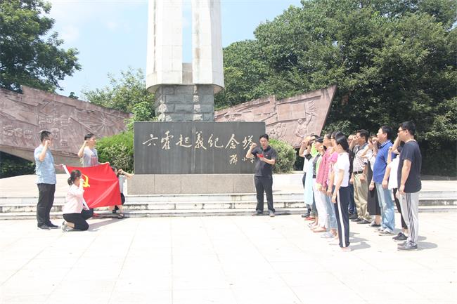參觀完革命舊址群,頂著烈日和30多度的高溫,攀登144級臺階,大家來到了鄧小平親筆題寫的六霍起義紀念塔,在支部宣傳委員兼紀檢委員、副總經(jīng)理陳建軍帶領下,大家面對黨旗和紀念塔進行了莊嚴的宣誓活動。