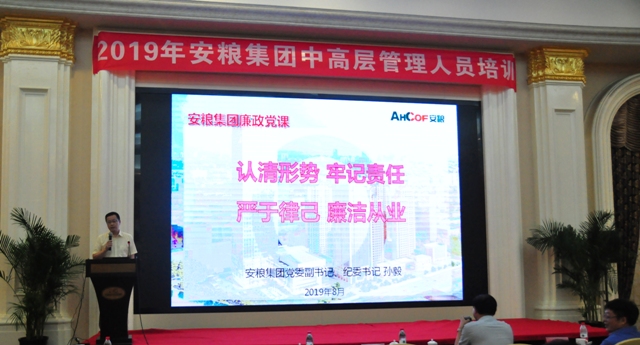 為深入推進(jìn)“不忘初心、牢記使命”主題教育,深化落實(shí) “三個以案”教育,8月16日至17日,安糧集團(tuán)黨委副書記、紀(jì)委書記孫毅在安糧集團(tuán)2019年中高層管理人員培訓(xùn)期間,為參加學(xué)習(xí)的安糧集團(tuán)、控股本部及貿(mào)易、建工兩大板塊的120多名黨員干部講授題為《認(rèn)清形勢 牢記責(zé)任 嚴(yán)于律己 廉潔從業(yè)》專題廉政黨課。