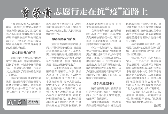 黃山人曾榮貴是安徽伊思頓糧油食品有限公司黨支部書記,他是一名傷殘退伍軍人,擔(dān)任阜陽益愛志愿者協(xié)會副會長,曾積極參與過大小百余次公益活動,被評選為“助人為樂黃山好人”稱號。在今年新冠病毒蔓延的特殊時(shí)期,曾榮貴不僅捐資戰(zhàn)“疫”,更沖鋒在前。正月初一,他就協(xié)同當(dāng)?shù)卮鍍晌e極投入到防控疫情一線,白天走進(jìn)村委會和公共場所開展防疫消毒,幫助村兩委工作人員開展出入人員管控;晚上編輯公眾號文章,宣傳防疫活動和防疫過程中的好做法,用行動踐行了共產(chǎn)黨員的初心使命,發(fā)揮了黨員的先鋒模范作用。