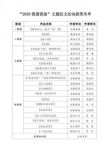 安糧集團(tuán)工會自接到通知后,組織各分工會、工會小組積極動員員工,踴躍投稿,共征得稿件42篇,占國貿(mào)集團(tuán)總投稿數(shù)84篇的一半。最終,安糧期貨龔悅的《諾守初心,花開“疫”落》和安糧實業(yè)曾榮貴的《為愛抗“疫” 靜待花開》分別榮獲一等獎和三等獎,安糧控股蔡曉煒的《巨人的歌》等7篇作品榮獲優(yōu)秀獎。安糧集團(tuán)因高度重視、精心組織,特別榮獲優(yōu)秀組織獎。