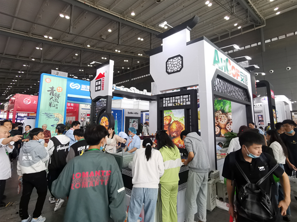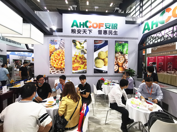安糧實(shí)業(yè)展臺(tái)設(shè)計(jì)延續(xù)了往年廣受好評(píng)的徽派建筑設(shè)計(jì)模版,粉墻黛瓦成為一道亮麗的風(fēng)景線。全新設(shè)計(jì)的產(chǎn)品宣傳冊(cè)高端精致, 黃金薯?xiàng)l、親嘴藕丸等新產(chǎn)品也引起了同行和觀眾的極大興趣,紛紛表示希望在展會(huì)結(jié)束后進(jìn)行深度對(duì)接。