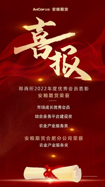 1月30日,鄭州商品交易所發(fā)布關(guān)于表彰2022年度優(yōu)秀會(huì)員的決定,安糧期貨榮獲鄭商所“市場(chǎng)成長(zhǎng)優(yōu)秀會(huì)員”“綜合業(yè)務(wù)平臺(tái)建設(shè)獎(jiǎng)”“農(nóng)業(yè)產(chǎn)業(yè)服務(wù)獎(jiǎng)”三項(xiàng)榮譽(yù),安糧期貨合肥分公司在產(chǎn)業(yè)服務(wù)優(yōu)秀營(yíng)業(yè)部評(píng)選中榮獲“農(nóng)業(yè)產(chǎn)業(yè)服務(wù)獎(jiǎng)”。