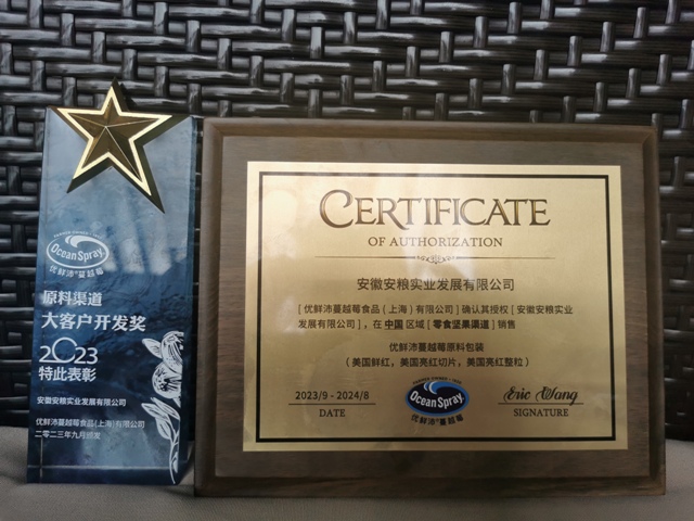 安糧實業(yè)獲得優(yōu)鮮沛品牌授權,并榮獲“大客戶開發(fā)獎”,不僅是對安糧實業(yè)在休閑食品原料領域專業(yè)性的認可,也是對我司市場開拓能力的信任。通過共享資源、互換優(yōu)勢,安糧實業(yè)與優(yōu)鮮沛將共同推動休閑食品行業(yè)的發(fā)展,為廣大消費者帶來更多美味、健康的休閑食品,未來安糧實業(yè)與優(yōu)鮮沛的合作會讓更多客戶采購到高品質休閑食品原料和新鮮蔓越莓產品。