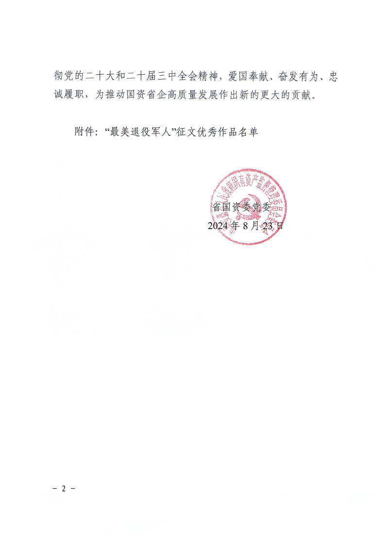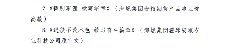 近日,安徽省國資委黨委通報了“最美退役軍人”征文活動優(yōu)秀作品名單。安糧集團選送的兩篇作品《退役不改本色 續(xù)寫奮斗篇章》《揮別軍涯 續(xù)寫華章》均獲評“優(yōu)秀作品”。